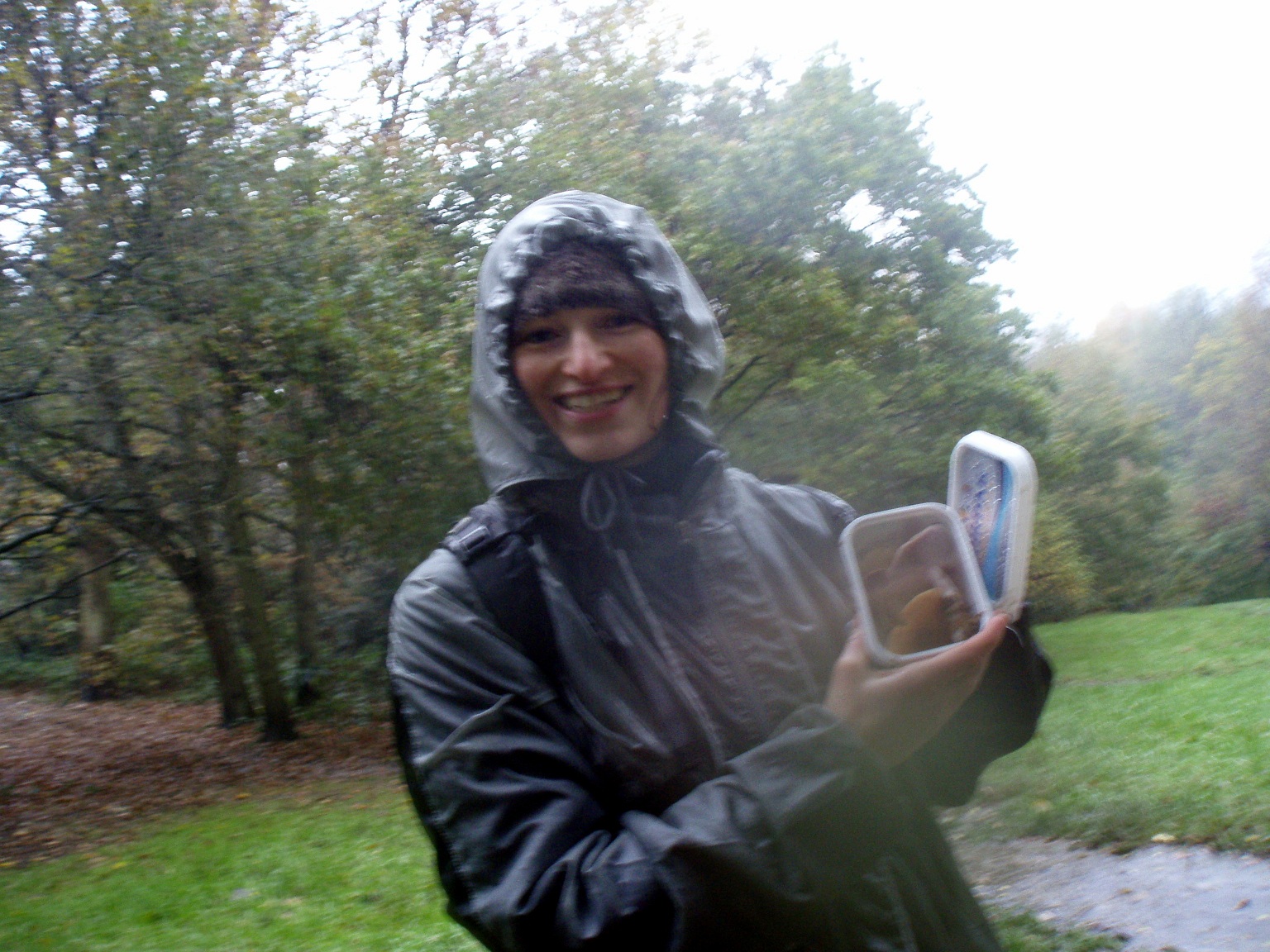I got properly soaked. My jeans were wringing wet , as were each of the 3 woolen jumpers I had on – because I found out my waterproof wasn’t. Huge luck and circumstance meant there was a change of clothes in the car waiting for me when I got back to the pub, for which I am eternally grateful. Here I am, very wet, with cheesy grin and a butter tub of nommies.