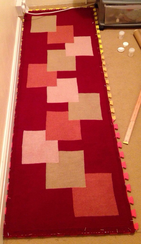 This stole was a very easy knit, if large. The pattern is completely predictable and memorisable, there’s no shaping and it’s all stocking stitch except for the garter stitch border. The “stairs” divide the pattern into sections, so you can easily see how much progress you’re making. For some reason, I find that knits with clearly defined sections go much faster than knits that just say “keep going until it’s x long” – perhaps because I keep getting out the tape to measure it!