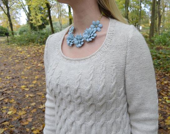 Before I knit Nostepinne, on cold days I would wear an old grey jumper of my husband’s. It felt like wearing a cuddle, but it looked like a sack of potatoes. For Nostepinne, I took the best features of that jumper – the pure wool, soft grey colour, roomy ease, slightly-longer-than-usual sleeves and added other, more feminine features. The U-shaped neckline is flattering and leaves plenty of room for layering, while the elegant “Nostepinne” cables hide subtle waist shaping and create a “sweetheart” shape over the bust.