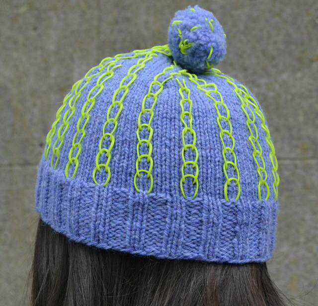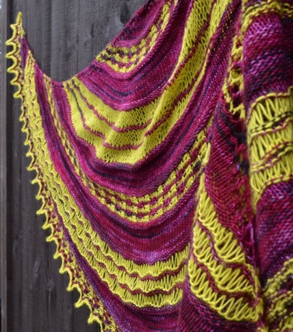 The Large sample for Knitty was worked using a variegated purpley-red and an almost-completely-solid grellow.