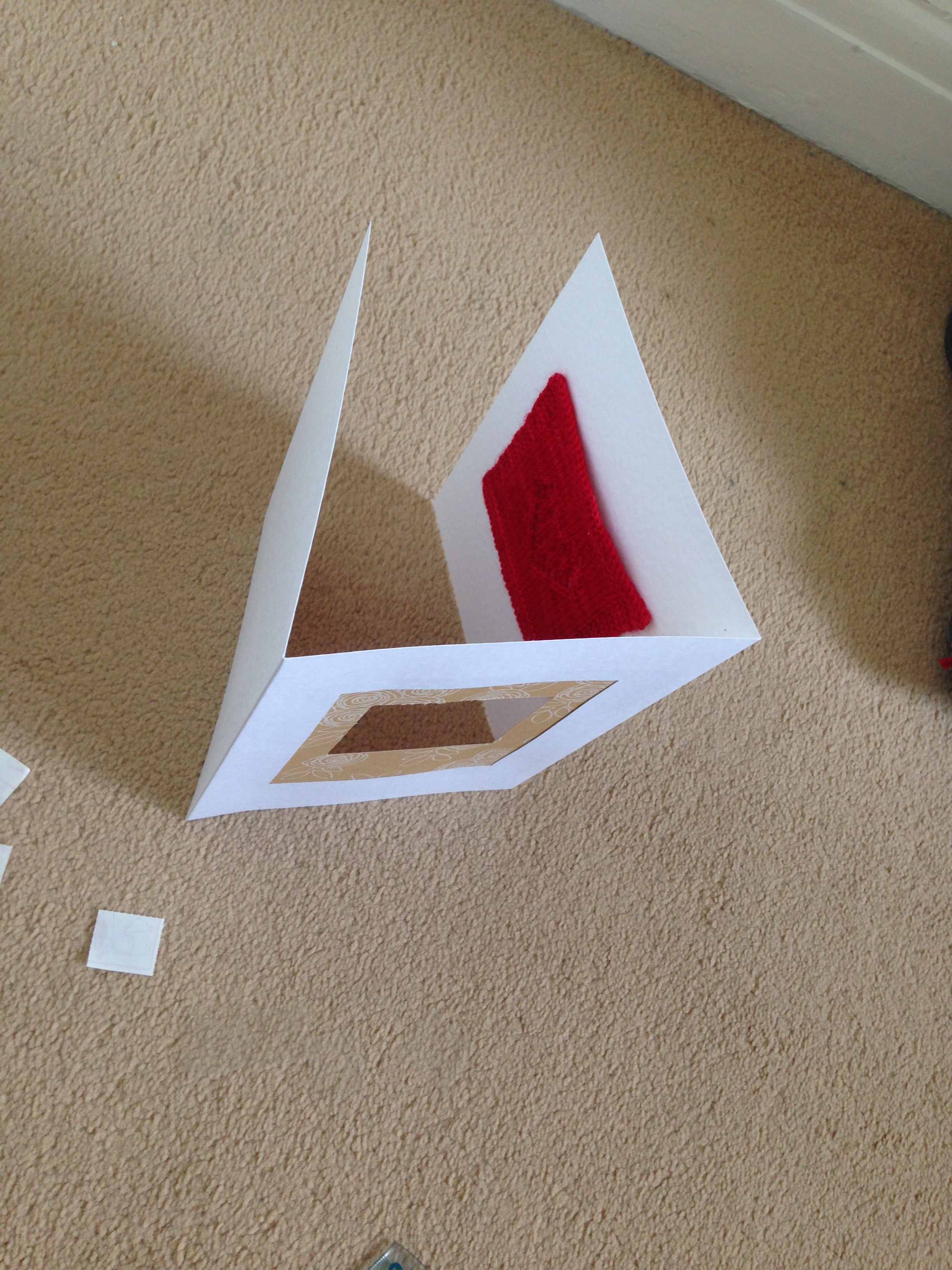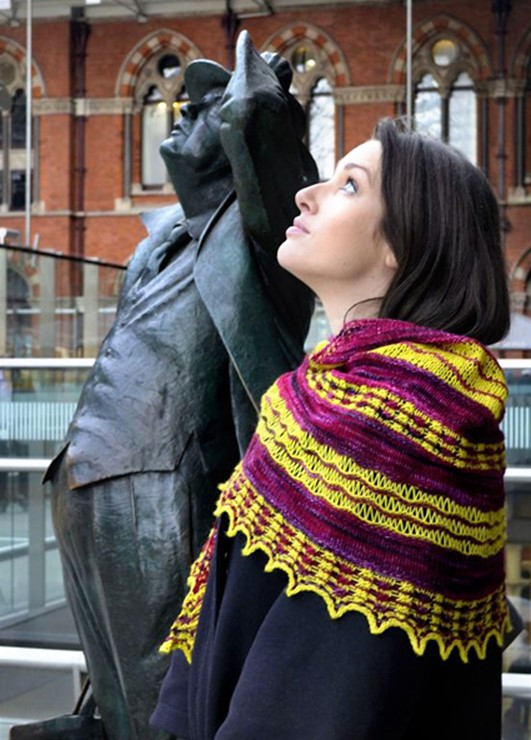 My beautiful sister models the crescent-shaped shawlette in St. Pancras station.