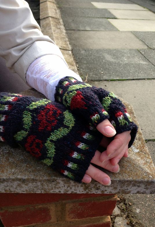 They feature roses and rosebuds in stranded colourwork. The flowers are mirrored, hand to hand, and the cuffs are done with corrugated ribbing. I used Rowan Fine Tweed to make them and it’s a lovely yarn. Great texture from a slightly thick-and-thin spin, and of course, those gorgeous tweed flecks.
