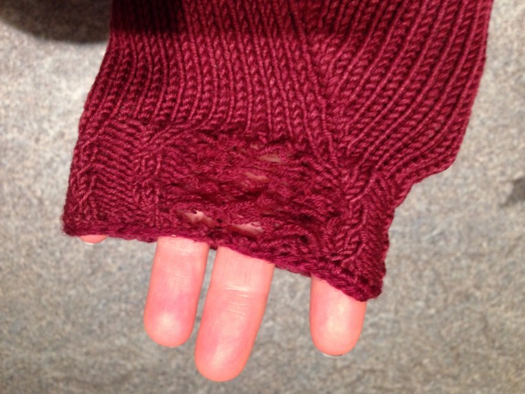 Then I worked in the original pattern (baby cable rib) for the same length as the cuff. I picked up a St from the jumper at the corresponding point at the start of each row. I cast off by working slip st into the cuff cast-off and slipping the previous St over. The cuff cast-off was quite firm actually, as I had replaced that recently.