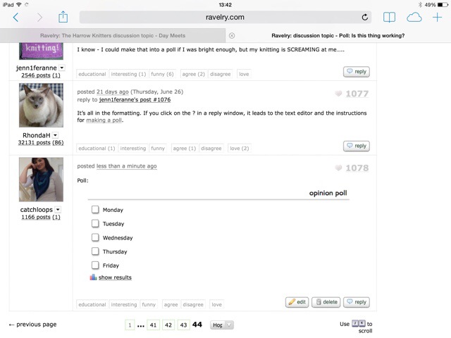 Here are pics of a (small) swatch worked in this manner (a) from the front; (b) from the back and (c) pinned out for measuring with the strings cut.